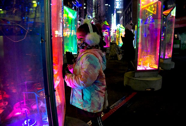 Prismatica is located on the Broadway pedestrian plaza, between West 39th and 40th Streets, and features a series of 25, 6-foot-tall light-up prisms.