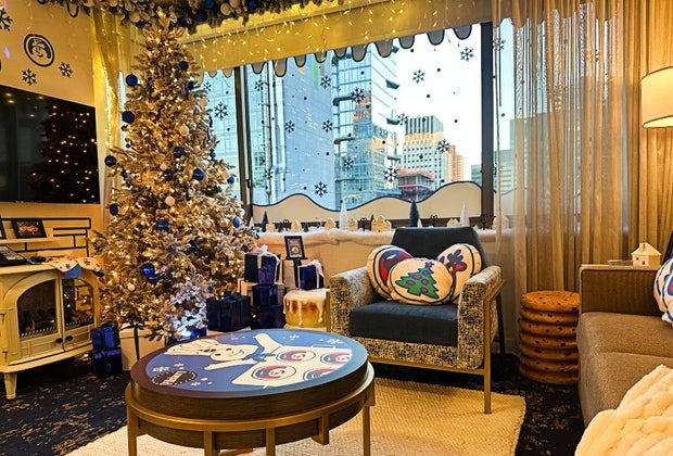 The decked out suite beckons you from the moment you step off the elevator, and twinkling lights frame the windows. A sparkling Christmas tree and endearing touches like cookie and cinnamon roll pillows make for a picture-perfect backdrop for holiday pics.