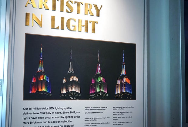 The Artistry in Light exhibit reveals how renowned light designer Marc Brickman brings the Empire State Building's tower lights to life, as clips play from a selection of the tower light shows he's choreographed since 2012.