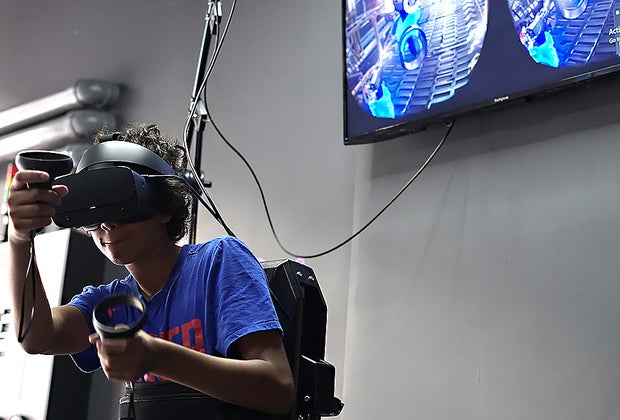 While there are no age minimums here, I'd say Escape Virtuality is best for older tweens and teens. Many of the games contain mature, shooter-style environments, and younger kids can't always be outfitted with the gear that's offered.