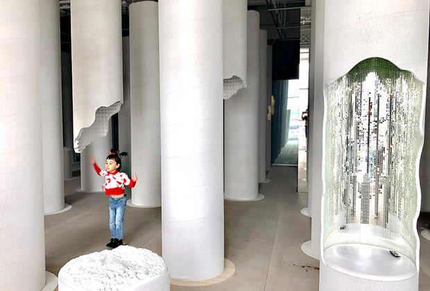 While my little Yeti played house, I did a quick spin through the space, weaving in and out of the columns. Some were lined with foam prisms while some others were adorned with peek-a-boo cut-outs and white ping pong balls. Strings of white beads hung from some of the openings in the columns, shielding the entryways. The mirrored walls in the room created an interesting infinity effect—as well as infinite opportunities for selfie-taking.