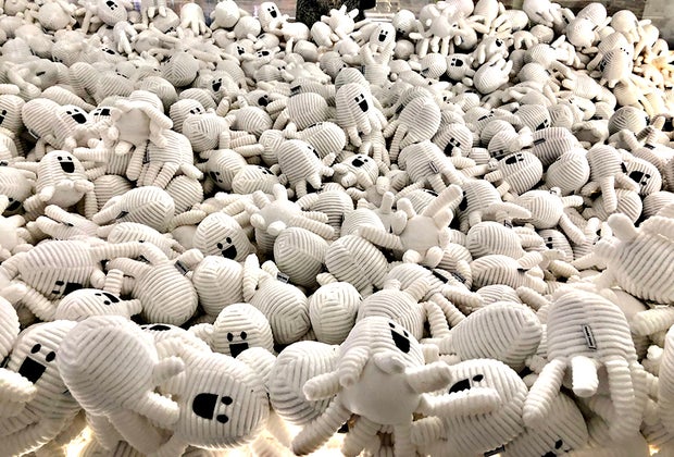 A soundtrack produced by the Polish electroacoustic musician Jacaszek plays throughout the Snark Park installation space. While the art installation is housed in one room, there is also a secret room, located behind a two-way mirror, that looks out into a giant claw machine filled with little white plush toys dubbed “snarkies.” Visitors can try their luck at claw-grabbing a snarky to bring home.