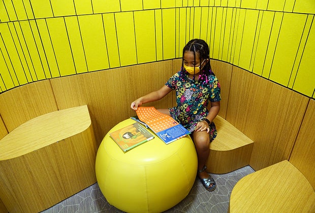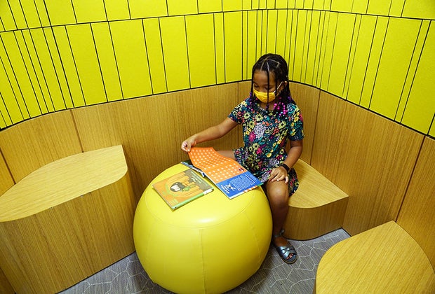 Child-sized furniture dots the children's section, and we had lots of fun ducking into a bright yellow corner nook for a private story time during our visit. There are a few toys—and we'd expect more as public health conditions allow—and plenty of kid-sized bookshelves teeming with selections, plus plenty of computers at kid-sized desks for young visitors to use.