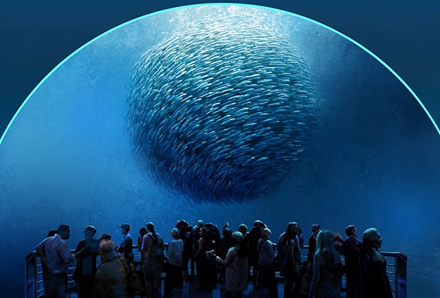 No wet suits are required—in fact, you won’t even get wet. Instead, this virtual 60,000-square-foot aquarium of sorts will rely on video mapping, animation, huge projection screens, sound, and even holograms and touch screens to show visitors not only the magic of the ocean, but also the life it contains.