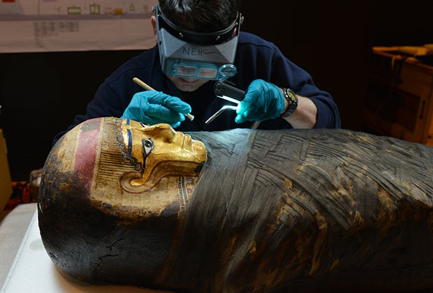 Top photo: A conservator at Chicago's Field Museum prepares the mummy known as the “Gilded Lady” for display at AMNH. Photo by D. Finnin/courtesy AMNH.