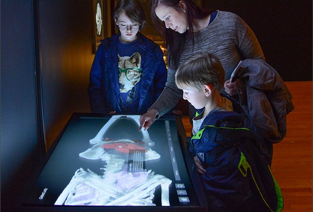 Visitors can “unwrap” Egyptian and Peruvian mummies at several touch screens that are part of the exhibit. Photo by R. Mickens/courtesy of AMNH.