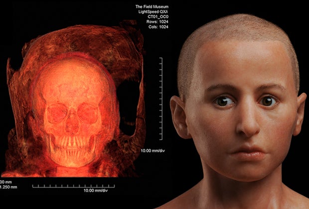 French artist Elisabeth Daynes illustrated what this mummified boy looked like using CT scans and a 3D-printed reconstruction of a skull. Scan image, left, courtesy of The Field Museum; sculpture photo, right, courtesy of E. Daynes.