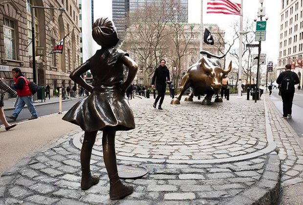 The Fearless Girl stares down the Charging Bull. Photo by Erin Martell