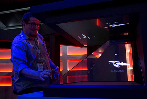 At the Inspect the Fleet interactive station, leap-motion technology allows visitors to browse and manipulate holographic models of iconic Starfleet vessels.