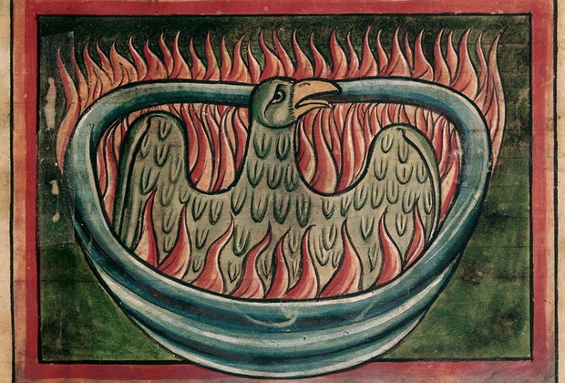 See a phoenix rising from the ashes in a 13th-century bestiary. Courtesy the British Library via NYHS