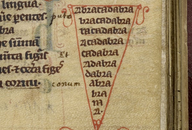 See the first recorded mention of "abracadabra," as a cure for malaria, in Quintus Serenus, Liber medicinals. Courtesy the British Library Board