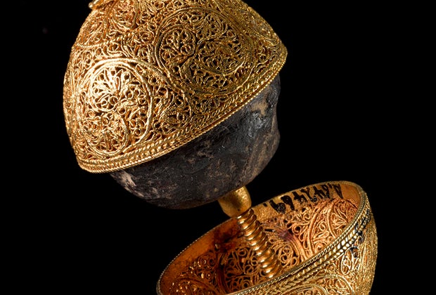 This gold filigree case contains a bezoar, a stone-like mass taken from the stomach of a goat that acts as an antidote to most poisons. Courtesy the Wellcome Collection/Science Museum