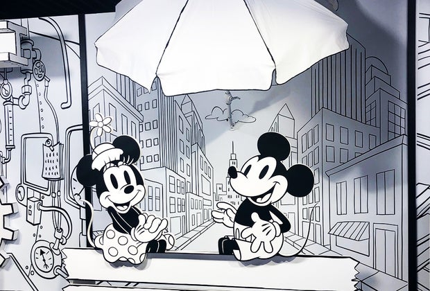 Room after themed room offers artwork and more interactive elements to explore: The "It’s Black & White" room features throwback comic strips, optical art and more photo ops with a pre-color Mickey and Minnie. Kids will love running through the bright, colorful "Ink & Paint" room. The "Burst Into Color" room celebrates a more modern version of Mickey and friends with a vibrant crochet wall.