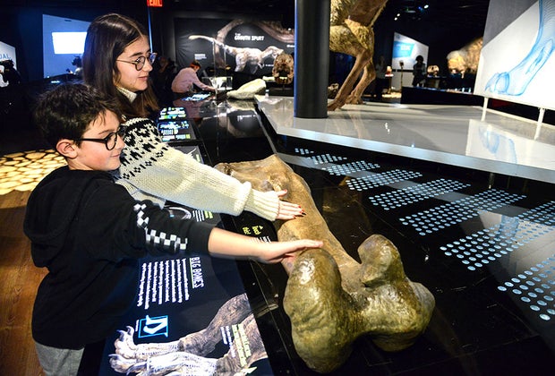 A full-size reproduction of the museum's T. rex fossil from the Hall of Saurischian Dinosaurs takes up plenty of real estate in the middle of the exhibition, and has an interactive shadow that comes to life, moving in the way scientists believe T. rex did, making the hall echo with the sounds of monstrous footsteps.