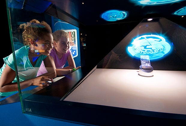 In another sci-fi movie staple, kids can receive a hologram message from Titan. As the exhibit explains, it’s actually a faux-hologram, because the real thing is so complex, but little ones delighted in the hovering projection of a spaceship.