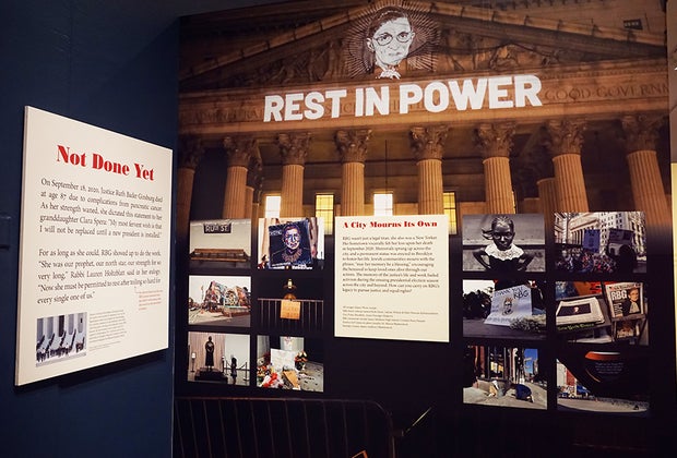 The exhibition, which runs through Sunday, January 23, 2022, traces the life of the late Supreme Court associate justice, from her Brooklyn upbringing to her death in 2020—and the memorials that sprang up citywide in the aftermath.