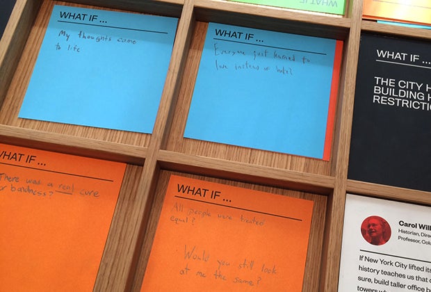 While my kids designed away, I took time to wander the large, open room of the Future City Lab and take in offerings like Living Together and Making a Living, which offered touch screens featuring the work of street photographer Joseph Michael Lopez, as well as stories from residents of different NYC neighborhoods. In the same room, I took in Mapping New York City: 2000–2050, a huge, slide-shaped installation, as well as Then & Now & Then, a film by Michael Goldberg, in which New Yorkers discuss their hopes, dreams, and impressions of city planning.