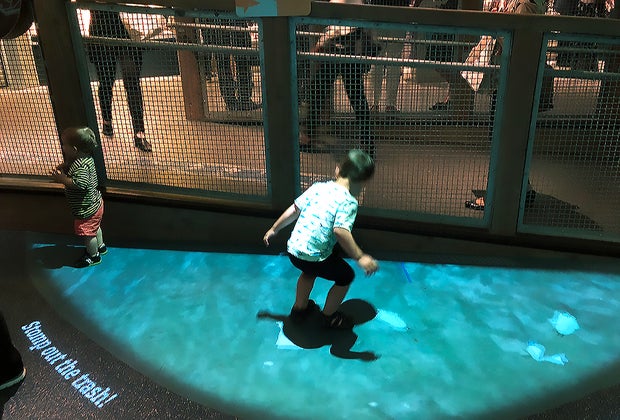 One of the last interactive pieces in the exhibit was a "Stomp the Trash" game projected on the floor. Visitors follow "floating" pieces of trash and stomp them with their feet. This was another big hit with the toddlers, and a great, interactive way to finish our visit. Since the aquarium is run by the Wildlife Conservation Society, there is an overarching focus on protecting our oceans and keeping them clean. The game is a fun, tactile way to bring awareness to their mission.