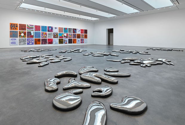 "Clouds" is a 90-part floor installation included in Kusama's exhibit "Every Day I Pray For Love."