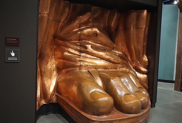 In the Immersive Theater, a three-part video lays the groundwork for Lady Liberty's journey before you are taken into a replica of Bartholdi's workshop. Here, you'll experience through videos and models how the sculptor was able to create the Statue of Liberty's grand scale, starting with a small plaster model and gradually increasing his measurements to create the larger-than-life monument we know today. The statue's copper cladding was pounded to a width of 3/32 of an inch—that's the equivalent of about two pennies stacked upon one another—to give her robes and facial features their final shape and detail. You'll also get an up-close view of a replica of her foot. Signs nearby encourage touching; kids will likely notice the copper inside maintains its shiny, penny-like coloring, safe from the elements that have oxidized the Statue outside.