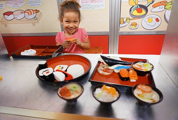 Once she had worked up an appetite, she headed next door to the Bento Box storefront, where she couldn't get enough of playing restaurateur with the tiny sushi play food. Displays overhead explained how the bento box came to be as a way for Japanese mothers to fill their kids' lunch boxes (and bellies!) with leftovers and detailed the way they "cutetify" their lunch creations, putting my ham-and-cheese sandwiches to shame.