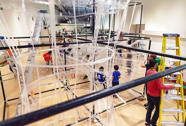 Part museum exhibit, part playground, TapeScape features climbable tunnels that pulse with spirals of LED lights. TapeScape creator Eric Lennartson says, “We can showcase simple scientific concepts that even the youngest kids can understand and still be interesting to an adult that is an engineer. Does it look like a spider web, the human circulatory or nervous system, or some science fiction galactic wormhole? No matter your age or education, there is something almost everyone relates to and finds interesting.”