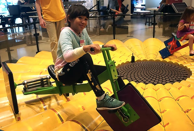 2. The Square-Wheeled Tricycle: If you know anything about MoMath, it's probably this display, located on the ground floor of the space. Kids can test-drive a pair of square-wheeled tricycles and see for themselves how deceptively smooth the ride can be, thanks to a platform where the wheel's corners fit perfectly within the wavy grooves. Visitors beware: There's a strict closed-toe shoe rule for both tricycles (there's one for little kids, and a second for older children and adults), so leave the sandals at home. Another fun "ride" my kids enjoyed was the Coaster Rollers, where riders propel a sled-shaped vessel back and forth across a bed of acorns, and again, thanks to principles of math, the ride is smoother than it looks.