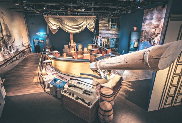 Occasionally, the texture of the exhibit floor changes to create different settings, transporting guests in time to key sights and places, including a gallery featuring a full-scale replica of Boston’s Liberty Tree. This nearly two-story tree is 18 feet tall and weighs 2,000 pounds, representing the site where the first stirrings of revolt were discussed and debated. The Battlefield Theater recreates the front lines of war, coupled with fog and lights, and a great recreation of Independence Hall shows its short-lived history as a prison for American soldiers during the British occupation in Philadelphia.