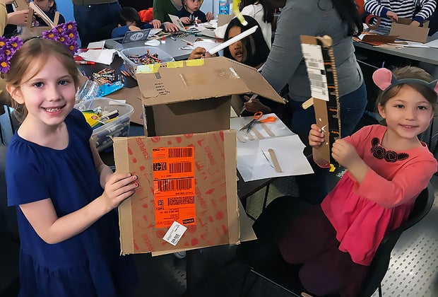 After reviewing the importance of recycling and learning that even skyscrapers can be made of recycled materials, the kids were provided with flattened cardboard boxes, empty plastic water bottles, bubble wrap, and the like, all repurposed from the museum's office bins. The children then constructed their own eco-friendly architectural masterpieces with brightly colored tape, Elmer's glue, and structural support from their eagerly hovering grown-ups. Afterward, everyone delighted in spotting familiar buildings in the galleries on their own.
