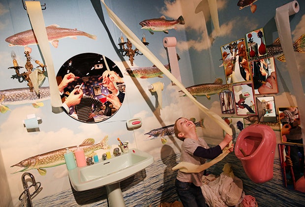 The wide open exhibit space of the Cadillac House has been transformed into several mini domestic settings for this installation, allowing visitors to roam from each mini room to the next, playing with the various props and staging improbable photo ops, from sitting on a faux alligator in the living room to picking up a toilet plunger and shower cap in the bathroom.