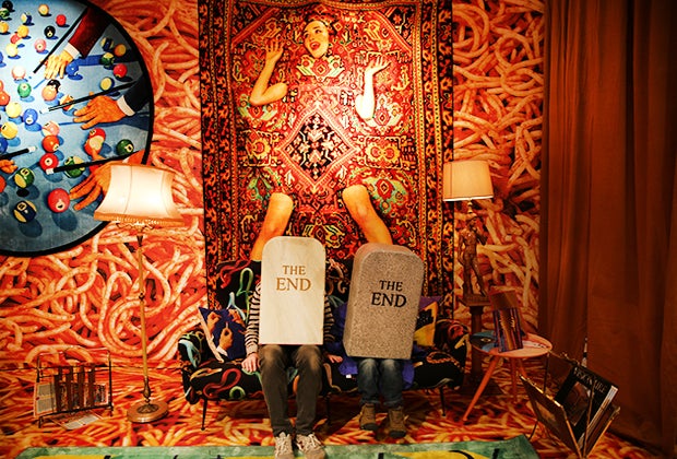 The visuals are over-the-top with a vintage feel and full of rich colors. There's popcorn wallpaper, a floor blanketed in images of spaghetti, and fish paintings on the wall. It's all meant to be a bit subversive and funny, reflecting the sensibilities of Maurizio Cattelan and Pierpaolo Ferrari, co-creators of the magazine. Housewares were produced by Gufram, an Italian furniture manufacturer, and Seletti, but customized by the artists.