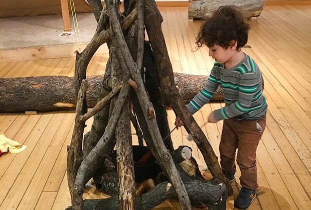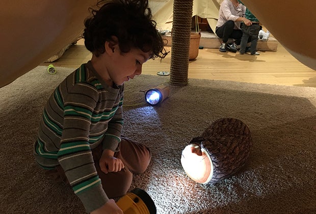 Upon entering, kids are ceremoniously provided with their own wilderness vests and camping bags to pack up for a journey into the “wild.” Once my apprehensive 4-year-old got wind that pretend food, tools, and an empty bag were in the equation, he packed his gear to voyage into the unknown. He discovered new worlds as he stumbled on a flashlight conveniently placed under a dark tent, realizing infinite shadow puppets were at his disposal. He figured out he could “roast” a pretend marshmallow after “starting a campfire” by wrapping the artfully stacked wood with beautiful, bright orange strips of fabric. He also could make a pretend meal in his tent while migrating to new friends inhabiting the other tents.