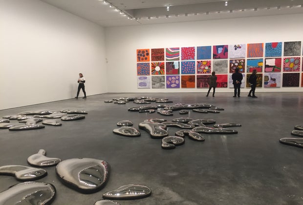 Kusama's new exhibit also features some works on canvas, as well as a few aluminum and fiberglass sculptures. There's also a 90-part stainless steel floor-based installation entitled "Clouds" that children will find interesting.