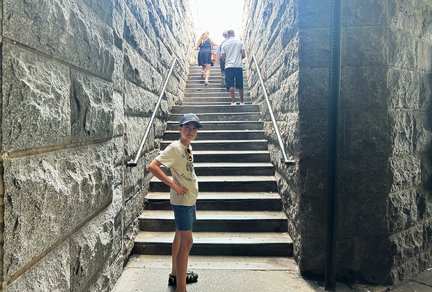 Ask the kids if they spot the cast-iron lamps, the circular "fans" on top of the towers (which are actually fences to prevent people from climbing), the American Flag, the Gothic arches, and all the cables. The cable spinning plaque is definitely worth a read to get a sense of how the cables were designed.