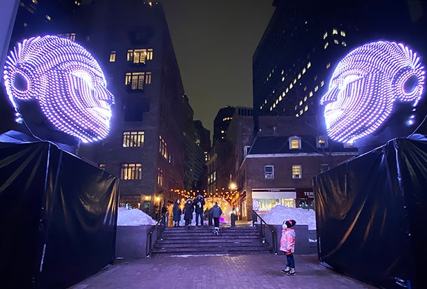 With Midwinter Break upon us, we've found the perfect excuse to blow bedtime: Strike out after dark for a Lower Manhattan art crawl where you can see Electric Dandelions, Talking Heads, and more fun public art sure to brighten these long winter nights.