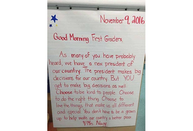 The future of our country lies in our children. Their values and future selves are being shaped by the experiences and world they live in today. In the days since the election, we’ve discovered hopeful signs, including wonderful educators like Mrs. Nagy in Connecticut who posted this inspiring message (above) to her first graders, reminding them to be kind. But educators can’t do it alone if bigotry is condoned from the highest level.