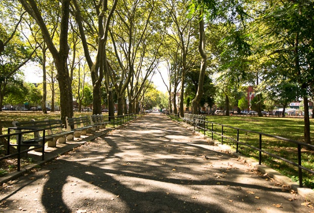 Tall trees line the walkways of Msgr. McGolrick Park, adding to the charm of this quiet Brooklyn spot. Photo by Erin via Flickr.