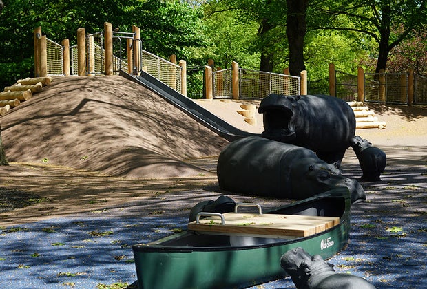 The latest Central Park playground to get a makeover, Safari Playground's new design strengthens the safari theme. River-colored safety coating now covers the area and play canoes are sure to inspire adventure. Replicas of the original hippos have returned to the revamped playspace and brought with them a user-activated sprinkler, play boulders to climb, and, for the first time, traditional play equipment.