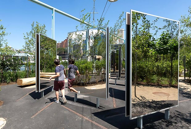 The newest section of Brooklyn Bridge Park lacks the physical play areas of its neighboring playgrounds (more on those below!), but this calm greenspace offers a welcome change of pace. Explore the shrub-lined path that leads to a walk-in kaleidoscope, mirrored games, parabolic reflectors, echo games, structures to climb, dance chimes, and more.