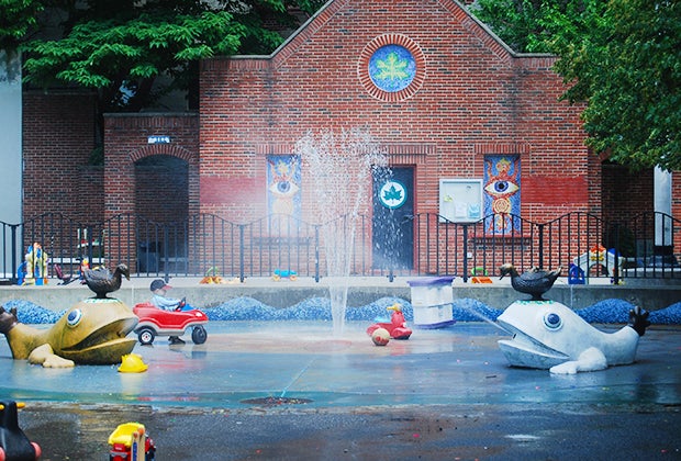 This music-themed playground behind the park’s bandshell features a harp with “strings” of water, and horns that spray a delightful blast to cool the kiddos. Fair warning: Thanks to the huge play structures, shady trees, and central location in Prospect Park, this playground gets busy.