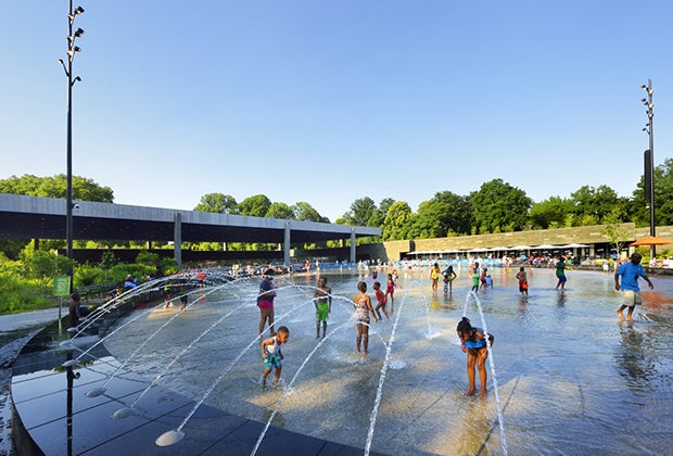 A cluster of 30-foot-tall sprinklers that look like cattails by a river’s edge will keep the kids cool and busy as they run through, over and over, in this Fort Greene gem of a park.