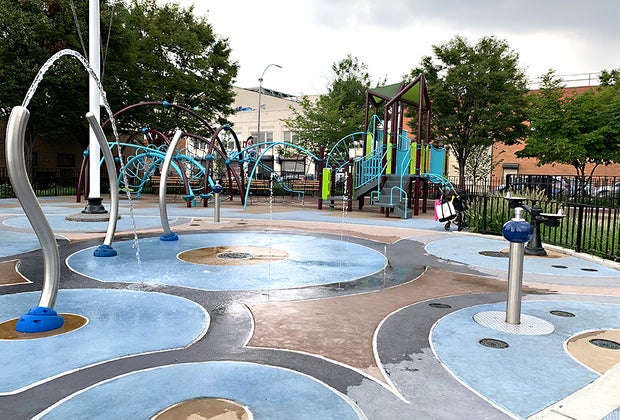 This park has a little of everything: Sprinklers, green space, climbing structures, and more!