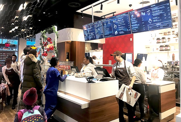 Unsurprisingly, everything on the menu is drizzled, dunked in, or stuffed with the trademark chocolate-hazelnut spread. Selections range from the classic (crepes, waffles, or pancakes with your choice of fruit and toppings), to the trendy (toast spread with ricotta and Nutella), the healthy (overnight oats and chia seed pudding laced with Nutella), and the completely over-the-top (my choice: Nutella creme brulee). The pastry case overflows with Nutella-stuffed pastries, cookies, and more, too.