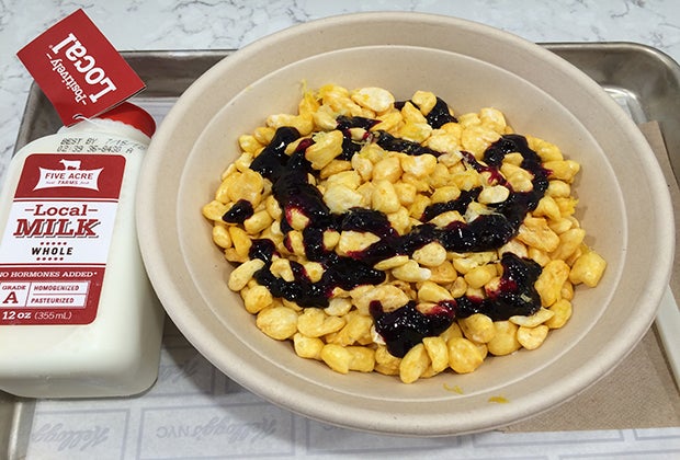 If you would rather leave your cereal-bowl creation to the experts, Tosi has put together six inventive concoctions that we never would have considered. Each is based on a Kellogg's cereal combined with several ingredients. Our favorites were the Chai Line (love the clever nod to the High Line), made of Crispix, peaches, and chai tea powder; and the Circus, comprised of Raisin Bran, toasted peanuts, and banana chips. All bowls of cereal come with a large Five Acre Farms milk, a local brand. Choose from skim or whole milk, or opt for soy milk for an extra dollar.