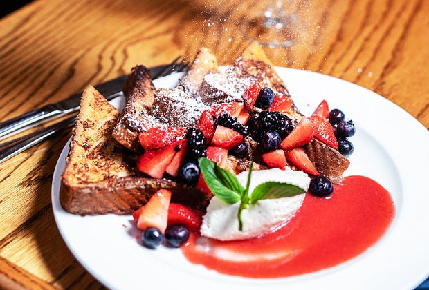 Try some of the fresh fruit pancakes at the family-friendly weekend brunch at Nocciola.
