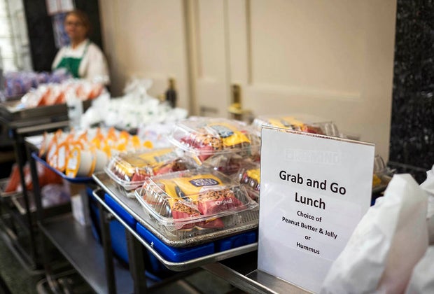 All school children and their families can pick up three free grab-and-go meals daily at DOE buildings from 9am-noon. Halal and kosher meals are available at selected sites.