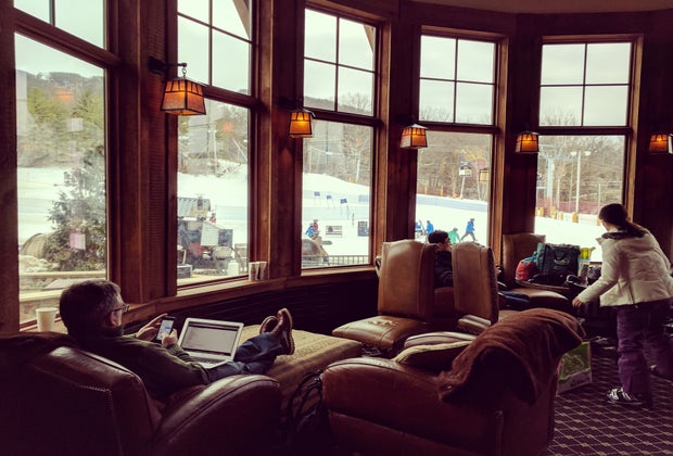 The newly renovated lodge is light and airy with a lovely fireside area featuring leather club chairs, perfect for non-skiers to lounge.
