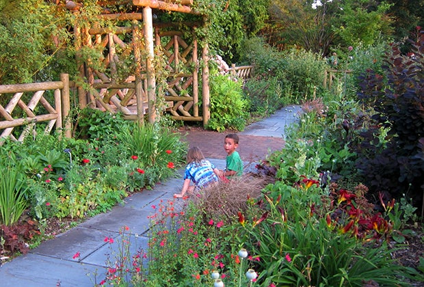 After a few moments taking in the views, we usually make our way to the nearby gardens. The flower garden offers bright colors and varying textures. My daughters like checking out the herb garden to see if they spot some of the same ones growing at their grandmother's house, but they particularly like the wild garden—and so do I. While they busy themselves racing through the narrow paths and hiding among the tall plants, giggling and crafting fantastic tales, I enjoy the hillside view of the Hudson and the gazebo nestled near the top.