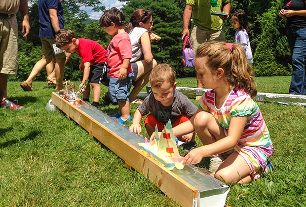 Kids float their handmade river rafts art project created during the weekly family art session. Photo by Joshua Bright/courtesy of Wave Hill.