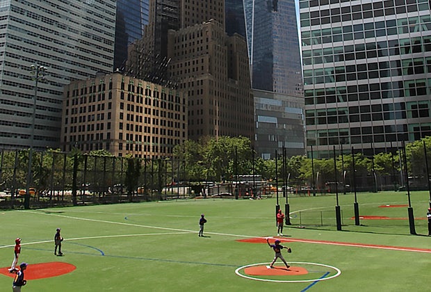 Downtown Little League's home field sits in the shadow of the Freedom Tower.